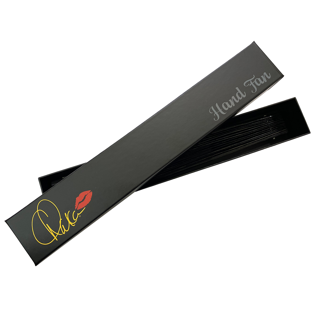 A folding papillion fabric hand fan with Chaka Khan "Lips Logo" graphic in metallic gold foil printed on the front fabric. Comes in a custom case. Custom case is 14" x 2" x 2.5". Fan unfolds to 25" x 13.5". These are very very cool and will keep you cool!